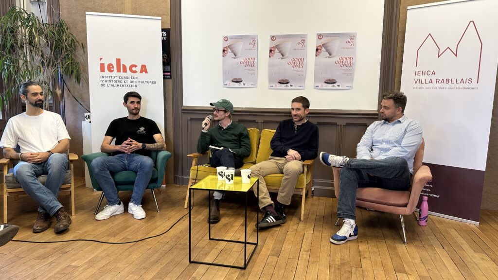 Christophe – lamarzoco, Antoine PERON – Coordinateur Éducation SCA France, Adrien Georges torrefacteur – Champion de France Cup Taster 2025 et Jonathan Le Pautremat – JLP Consulting. Animateur : Ethan